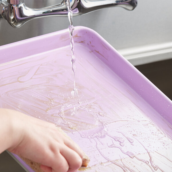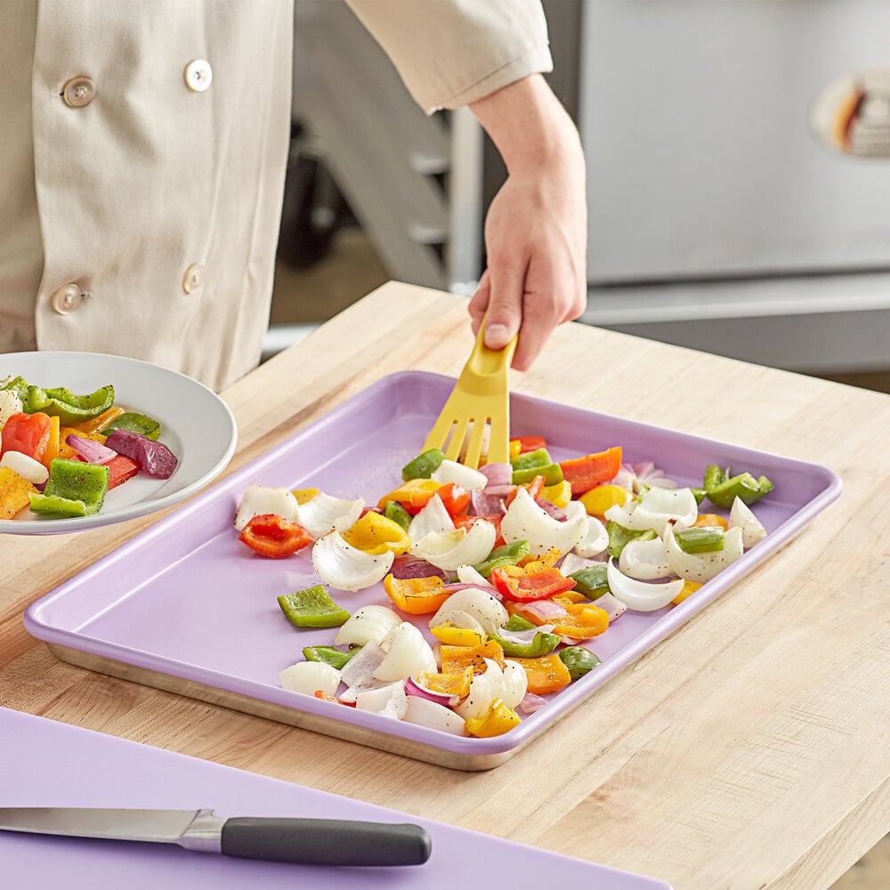 Perfect for everything from baking cookies to broiling chicken, this half size sheet pan is ideal for everyday use. Easy to identify, its bright purple coloring is designed to distinguish allergen-free meals in your establishment for reduced chances of cross-contamination. Separate your gluten-free, allergen, and dietary-friendly meals and desserts on this purple sheet pan to ensure safe service to your customers.