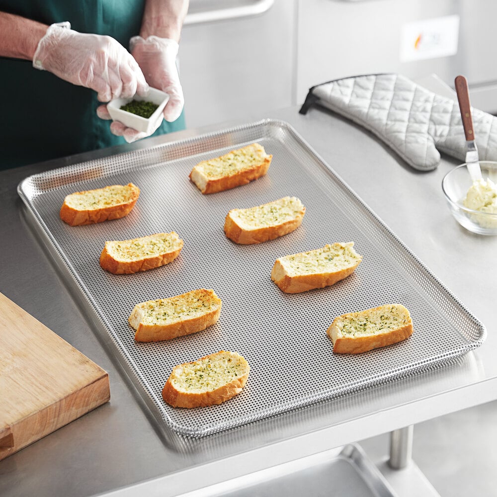 - Item #: 176fullfperfBaker's Lane Heavy-Duty Full Size 16 Gauge Glazed 18" x 26" Wire Rim Aluminum Fully Perforated Sheet / Bun Pan