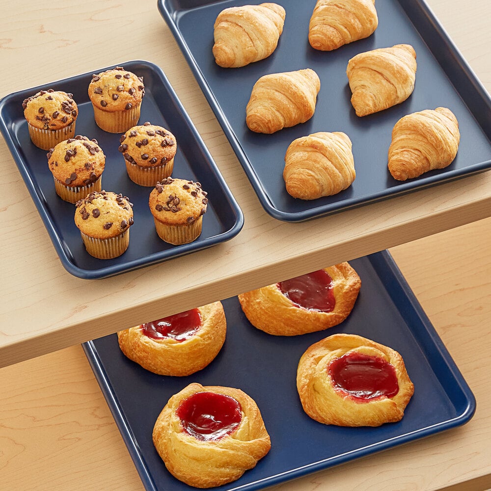 "This excellent quarter sheet pan covered in non-stick coating in a navy blue color is great. Truly non-stick. Looks pretty chic - much nicer to serve items on than the plain boring aluminum pans."