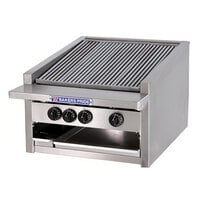 This countertop charbroiler also features an Easy-Lite / Always-Lit crossover pilot tube, a modular 6" deep stainless steel, front mounted work deck, belly bars, and a 24" deep broiling area. It operates on 252,000 BTU with a rear gas connection and pressure regulator.