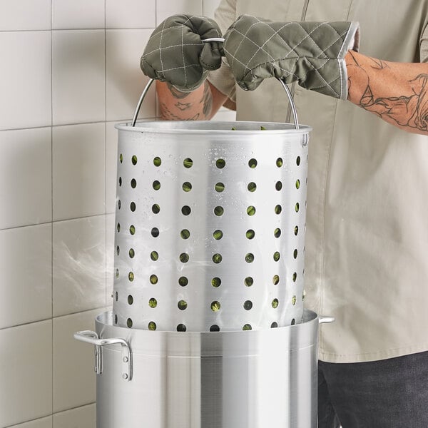 This steamer basket boasts a 40 qt. capacity, making it the perfect tool for blanching vegetables, rinsing pasta, draining foods, or even for canning purposes. Whether you're preparing a large batch of pasta or steaming vegetables for a crowd, this aluminum stock pot steamer basket is a must-have for any commercial kitchen looking to streamline their cooking processes.