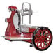 Perfect for slicing pieces of delicious prosciutto, signature meats, and cheeses right before your customers' eyes, this slicer pairs a precision knife with a low-resistance flywheel, classic design, and warm red color. It's ideal for specialty shops and delis, or any establishment looking for an authentic machine to provide tissue thin slices of meats as well as an addition to the aesthetics of your business.