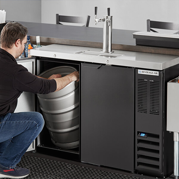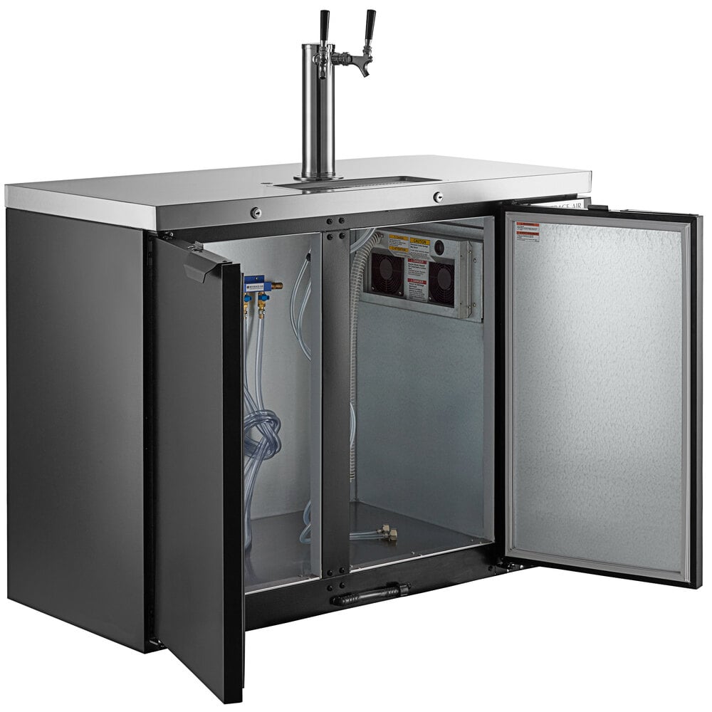 Add efficiency to your beverage service with this Beverage-Air kegerator beer dispenser. It holds up to (2) 1/2 kegs and is the perfect solution for busy bars, pubs, and restaurants to serve guests quickly. Plus, the attractive steel construction with a wear-resistant black vinyl finish promotes a professional appearance for long-lasting use.