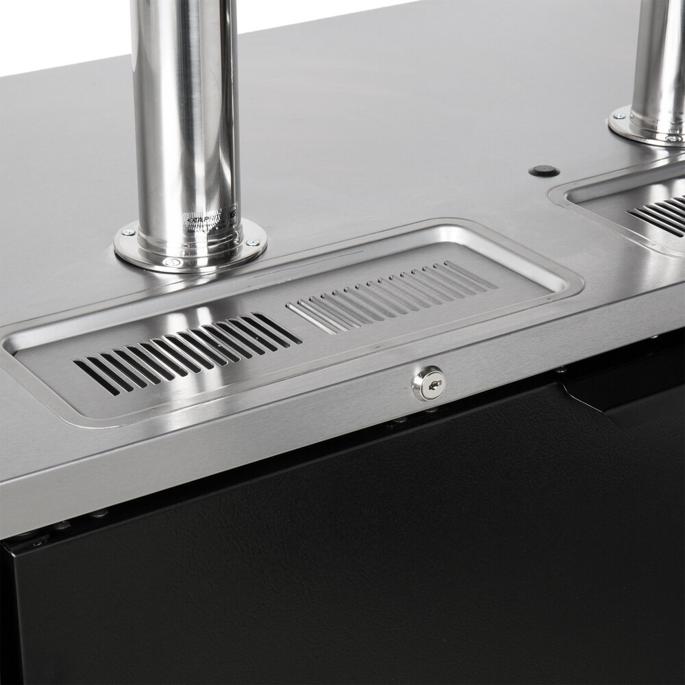 Featuring 2 tap towers with 2 and 3 faucets each, this kegerator makes it easy to serve your patrons delicious signature wines. The stainless steel tower and tubing allow you to serve wine, beer, or coffee without the need to retrofit, and the tubing protects against common beverage-spoiling bacteria. The built-in drip tray catches any stray splashes for easy cleanup at the end of the day.