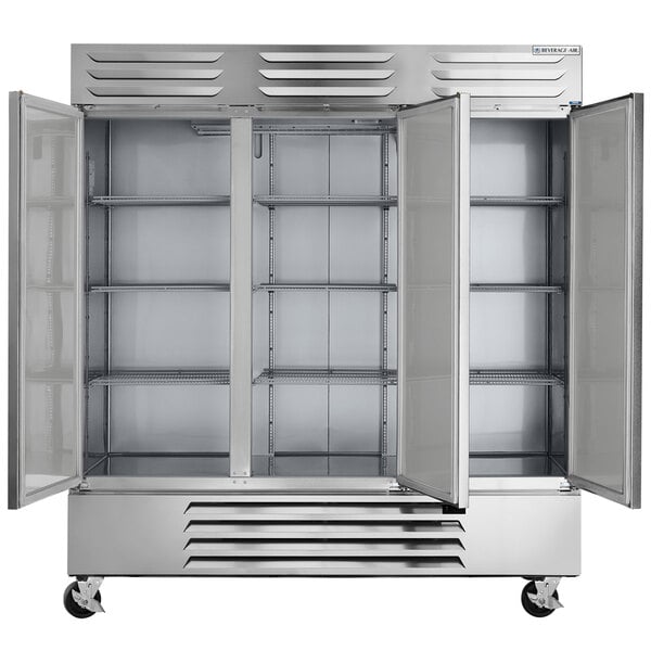 This Beverage Air FB72HC-5S 75" three section solid door reach in freezer is the perfect solution to cold storage in your restaurant kitchen, bakery, or other commercial food preparation area.