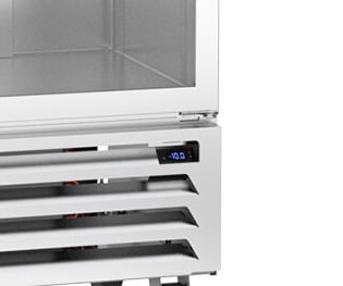 - Glass, left-hinged, self-closing door with stay-open feature and magnetic gasket