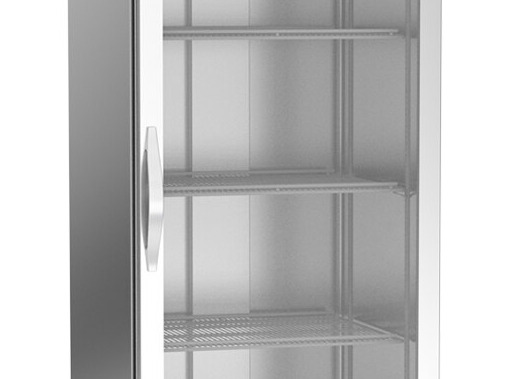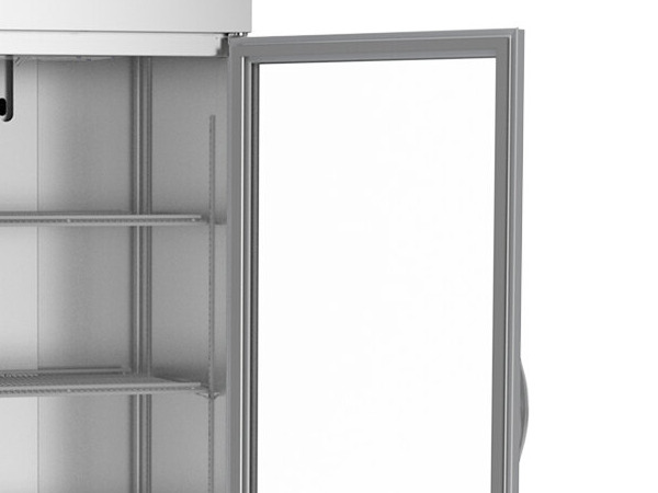 - Glass, left-hinged, self-closing door with stay-open feature and magnetic gasket