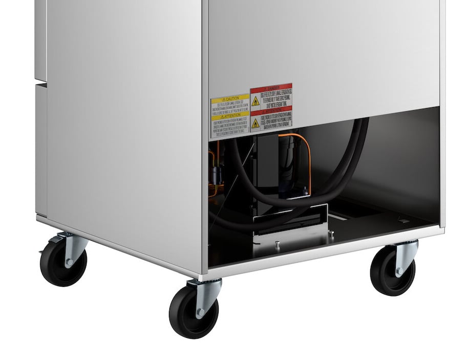 This unit boasts a bottom-mounted refrigeration system. This design makes it easier and safer to perform routine cleaning and maintenance, and because hot air rises it also allows the unit to draw in air from the coolest part of the kitchen. This cooler airflow improves efficiency and reduces strain on key refrigeration system components!