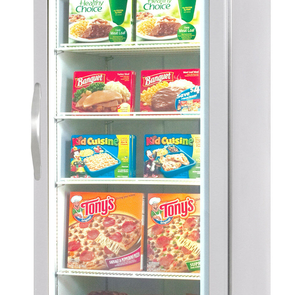 Easily accessible through a triple pane door, the freezer offers a spacious 26.57 cu. ft. interior with heavy-duty white coated steel walls and bright, LED lighting. This lighting illuminates the 5 heavy-duty epoxy-coated wire shelves, which each come standard with 4 shelf clips. The illuminated top lightbox allows the option to include your own merchandising sign to attract customers' attention. To make it easy to load and unload the freezer, the door includes a 120 degree stay-open feature, which is convenient when your hands are full of product. A triple pane, lowE argon-filled glass door retains cold temperatures exceptionally well, while snap-in gaskets ensure that the door seals tightly when closed, preventing cold air from escaping.