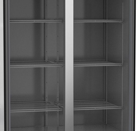 This unit features two translucent glass doors. Plus, for visibility, the see-through doors and bright LED lighting allow your staff to easily see and select the ingredients they need while minimizing the amount of time that the doors need to be opened. The spring-loaded hinges ensure that the doors close properly even when you have your hands full. If you are taking several loads to or from this unit, you can also override the self-closing system by opening the doors 120 degrees so that they stay open until you manually close them.