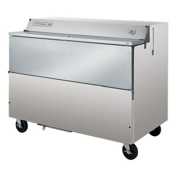 Perfect for any school lunch room, university dining hall, or cafeteria setting, this Beverage-Air SMF58HC-1-S 58" stainless steel 1-sided forced air milk cooler can hold up to 16 milk crates and provides quick, easy self serve beverage service. For peace of mind, this unit features a reinforced steel floor for maximum strength, and it comes with a cylinder lock to prevent tampering. Plus, an external thermometer lets you keep an eye on the cabinet temperature to ensure freshness.