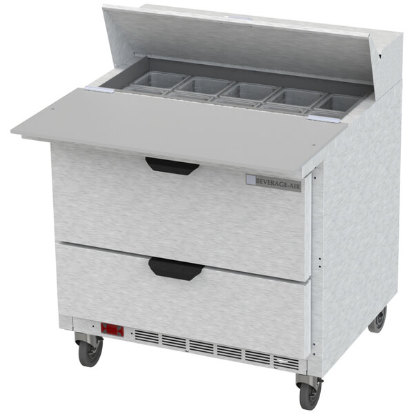 With a 17" wide cutting board, the Beverage-Air SPED36HC-10C-2 36" two drawer sandwich / salad prep table provides plenty of room to prepare your freshest salads, sandwiches and more! Its high-capacity refrigeration system boasts an optimized airflow pattern that cools the pans from the bottom for more even temperature distribution and improved performance. The top section can hold up to (10) 1/6 size food pans, while each drawer can hold one full size food pan and one 1/3 size food pan (up to 4" deep in top drawer, 6" deep in bottom drawer). A stainless steel front, sides, top, drawers and grille ensures years of dependable performance.