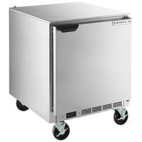 Thanks to its 1/2 hp compressor, this undercounter freezer's compressor runs on eco-friendly R290 refrigerant. This specialized refrigerant has an ozone depletion potential (ODP) of 0 and a global warming potential (GWP) of 3, making it an environmentally-responsible choice for your business. An interior thermometer is included, allowing you to always monitor the temperature of your product. Each cabinet is insulated with 2" thick foamed-in-place polyurethane insulation to further optimize temperature control while offering maximum energy conservation and structural integrity. This model also comes standard with 3" casters, which make cleaning and servicing much easier. It lowers the overall height of the unit, making it great for low counters and other areas with limited space. This model requires a 115V electrical connection.