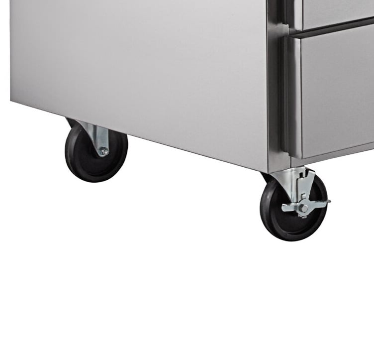 Beneath the top are 4 heavy-duty stainless steel drawers, which are each capable of accommodating a dynamic load of up to 275 lb. The drawers are also self-closing, shutting automatically when they reach the final 1-2" of their respective slides. Not only does this make it easier to close the drawers, it also helps reduce the amount of cold air from escaping into the environment. The slides even each boast 3 Delrin-encased stainless steel roller bearings to ensure that the drawers smoothly extend and retract.
