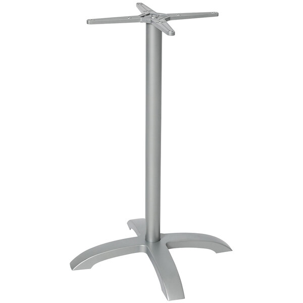 Create a dining experience as unique as the food you serve with this BFM Seating Bali silver bar height 4-leg table base! Suitable for use indoors or outdoors, this base fits select Chelsea, Longport, SoHo, Midtown, and resin tabletops (sold separately). Thanks to its simple yet sleek styling and dozens of possible tabletop combinations, you can be sure that this base will perfectly complement the decor of your pizzeria, burger joint, bistro, or poolside restaurant.