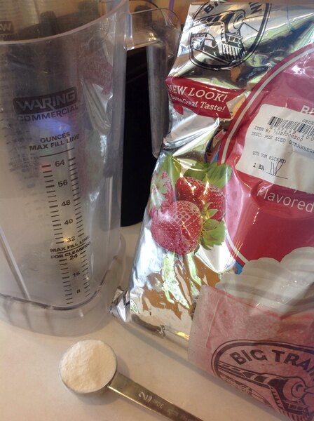Yummy Big Train drink mix... although REALLY sweet. We did find that if we added fresh strawberries to the drinks made individually in the blender, that it took away some of that overpowering sweetness and made the drink taste great. Our customers prefer the strawberry-shortcake-like taste when made this way.