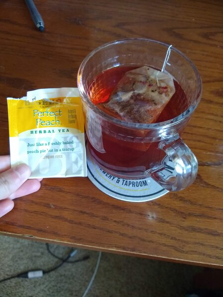 2 bags of Bigelow Perfect Peach herbal tea