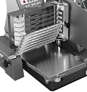 The simple controls and integrated diagnostic program for trouble-shooting make this unit extremely user-friendly. The drive is automatically shut off when the maximum height or number of slices is reached, upon reaching the end of the product, upon completion of the slicing procedure, or on Emergency Off. For added safety, the carriage and gauge plate have built-in safety locking systems to prevent accidental injury. This unit requires 120V for use.