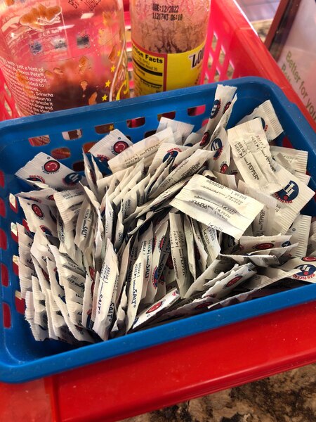 The difference between the salt and pepper packets aren't to good. There is a subtle difference between the two which isn't good. We had a customer grab a salt packet instead of a pepper packet and poured it on there food. We had to remake the food. Need better labeling for the salt & pepper.