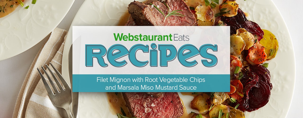 Filet Mignon with Root Vegetable Chips and Marsala Miso Mustard Sauce