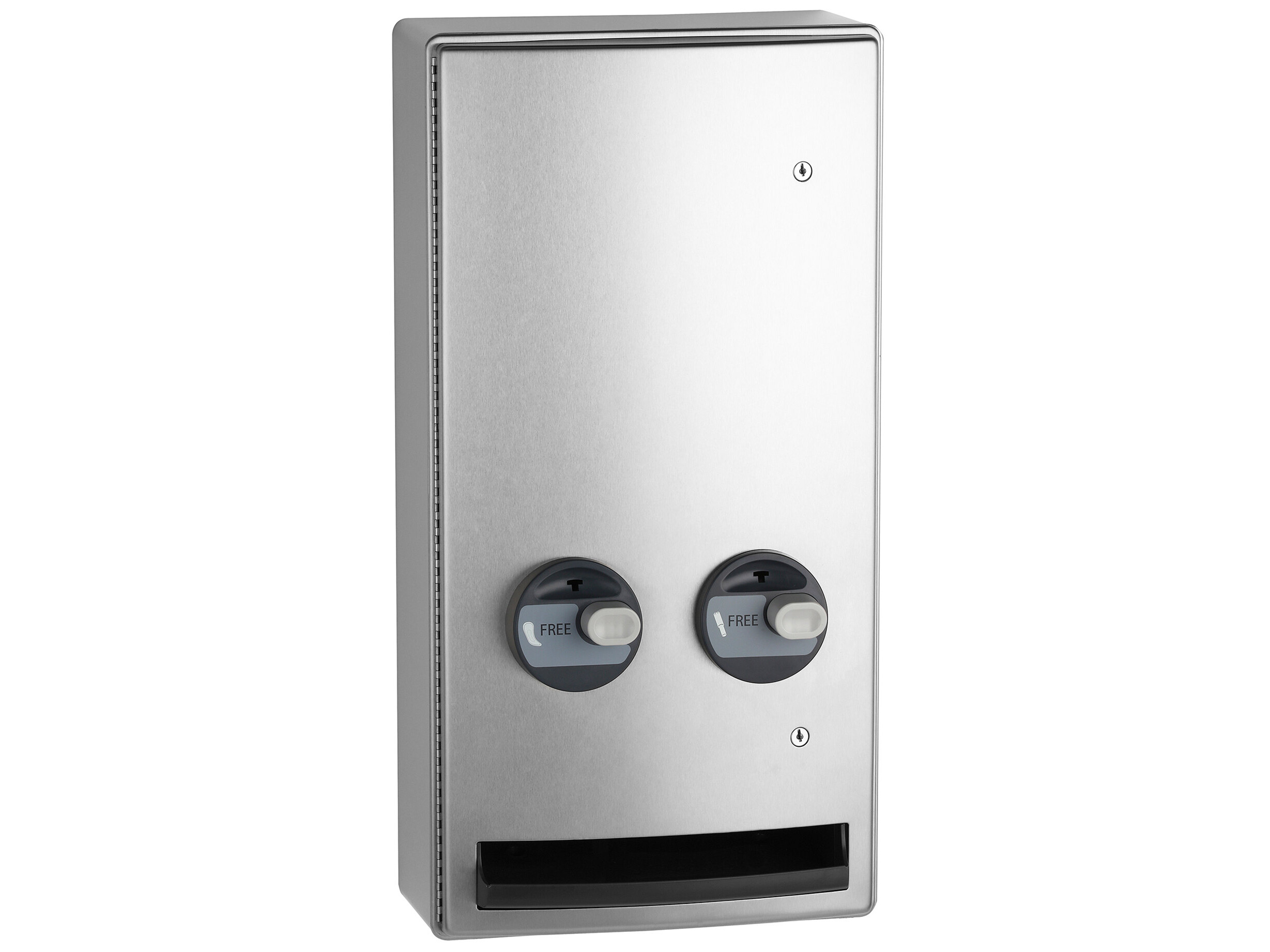 This napkin / tampon vendor is equipped with a key for employee access and two tumbler locks that are keyed to match most Bobrick restroom accessories (sold separately).