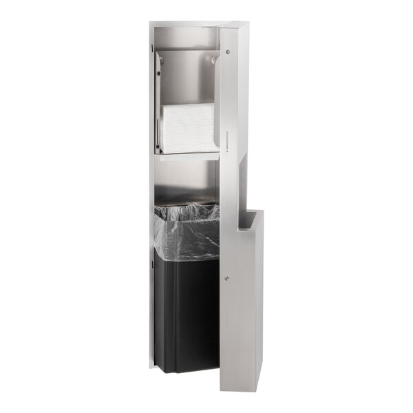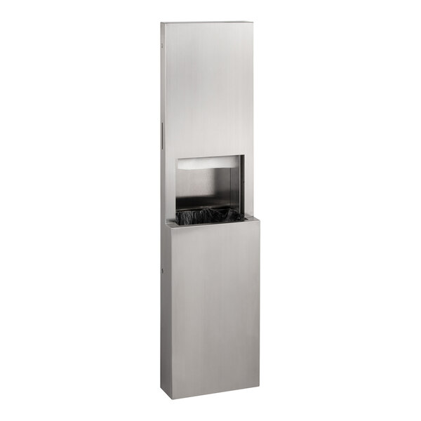 Equip your restrooms with the essentials with this Bobrick Fino paper towel dispenser / waste receptacle! This semi-recessed unit dispenses paper towels and collects waste in one convenient location, saving you both money and space. It features a type 304 stainless steel construction with a 20-gauge cabinet and an 18-gauge door and dispenser, and it has an an attractive satin finish. It boasts an all-welded construction with clean lines and concealed hardware for a refined, minimalist appearance.