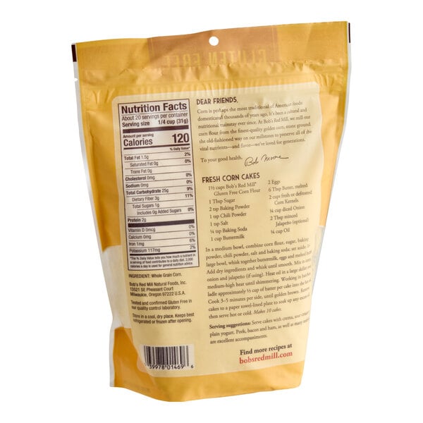This product is also ideal for using in your batter mixes for fried fish, chicken, or pork. Incorporate it into breads for golden color and hearty texture or try tossing some into your pancake or waffle batter to add extra richness to their flavor! With a wide variety of uses in your commercial kitchen, this Bob's Red Mill gluten-free whole grain corn flour is sure to become a staple ingredient in your establishment. This corn flour is packaged in (4) 22 oz. resealable bags to ensure you remain well stocked with this versatile product.