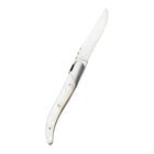 Provide an elegant touch to your tabletop setting with this Bon Chef Laguiole 8 3/4" steak knife with white acrylic handle. This steak knife is designed with the finest materials and the highest standards in mind. Its serrated, heavy-gauge stainless steel blade resists tarnishes, and the white acrylic handle makes the knife attractive and easy to use. The blade also boasts a fine, polished finish for added visual appeal. Use this pointed steak knife to cut meats like filet mignon, pork chops, or chicken.