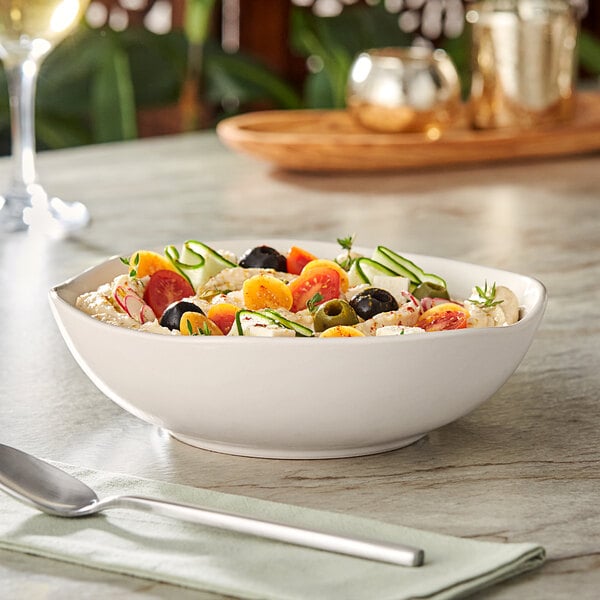 The organic shape of this bowl provides a handmade feel that adds a touch of elegance to your tabletop presentation. Crafted from fully vitrified china, this bowl is durable and long-lasting, making it perfect for daily use in your restaurant. Whether you're serving salads or pasta, this bowl is the ideal vessel to elevate your culinary creations.