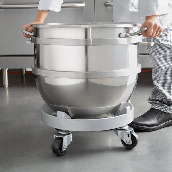 You can simply load the bowl right onto the dolly, wheel it to its next destination, and wheel it back when you're done. This bowl truck is made of durable and reliable cast aluminum that will handle long-term use with ease.