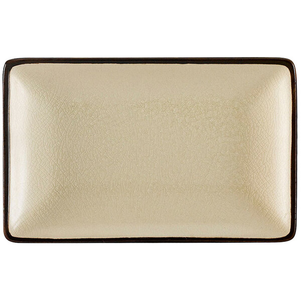Provide a superior backdrop for your most colorful meals with this CAC 666-34-W 8 1/2" x 5 1/2" black non-glare glaze and creamy white Japanese style rectangular plate. Featuring a large flat plating surface, this rectangular plate provides ample space for appetizers, tapas, sushi, and dessert while its curved rim makes it easy to contain sauces. Perfect for Asian-inspired restaurants, sushi bars, and catered events, the plate's non-glare glaze, creamy white color, and accented rim gives it a natural, handmade appearance that will help you create captivating presentations with your signature menu items.