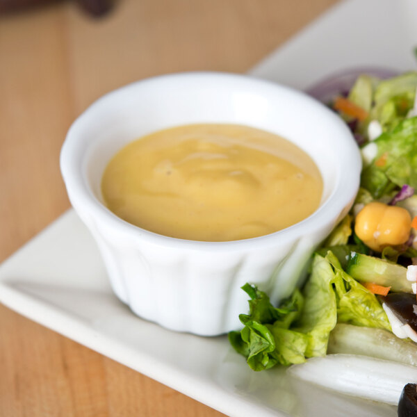 With their delicately crafted floral design, these CAC RMK-F3 bone white Festiware 3 oz. china floral ramekins come in a variety of colors and are ideal for serving sauces, salsas, dips, or condiments. You can purchase an individual color to complement your restaurant's decor, or choose a variety of different colors that will jazz up your table settings and create a distinct, festive atmosphere. They are perfect for your diner, ethnic restaurant, or other food service operation.