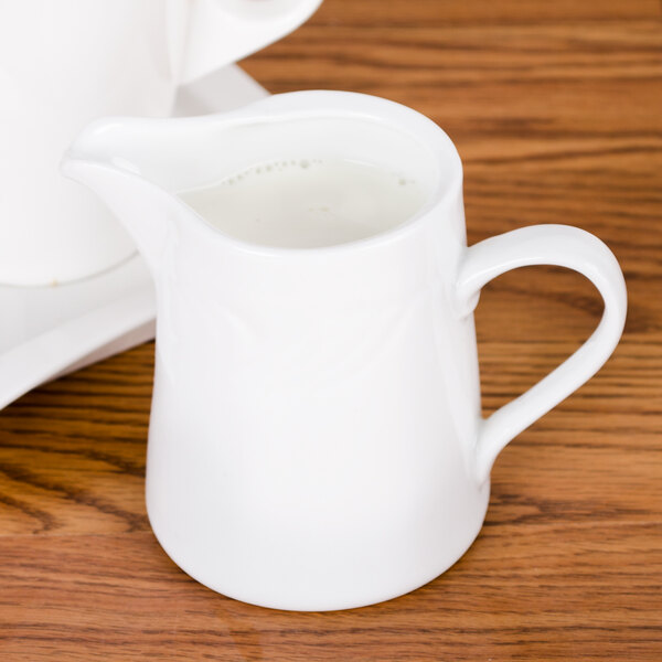 Complete your table settings with this CAC RSV-PC 6 oz. Roosevelt creamer! Like the rest of the Roosevelt line, its silky, super white body is offset by light, sculpted embellishments that are reminiscent of faint brush strokes. It's ideal for restaurants, diners, and even upscale catered events.