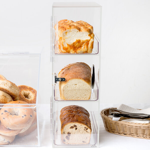 This Cal-Mil 1204 bread box is perfect for merchandising thanks to its tri-level structure, each with a removable acrylic tray for quick cleanup. For a unique twist, it is capable of standing vertically, or lying horizontally on any countertop surface. All you need to do is reorient the trays depending on how you want to use the display. Additionally, this case can be used in either full attendant service or self-serve locations for even more convenience. You can pair this case with a black acrylic or wood accent stand (sold separately) to match your unique decor.