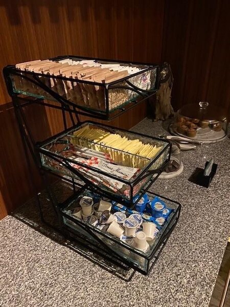 Love this!!!! This holds our sugar, sweetener, honey and creamer for tea in our Spa facilities - looks clean and not cluttered - easy remove and stock :)