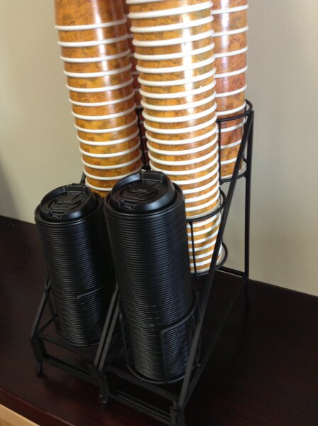 These are just what we needed. They hold cups and lids. The only problem is that people take their cup, fill it with coffee, and go over to where the sweeteners are kept and then realize they don't have a lid. So we found we need lids near the sweeteners as well as lids near the cups. But these take up much less space and keep the cups off the counter so they stay clean.