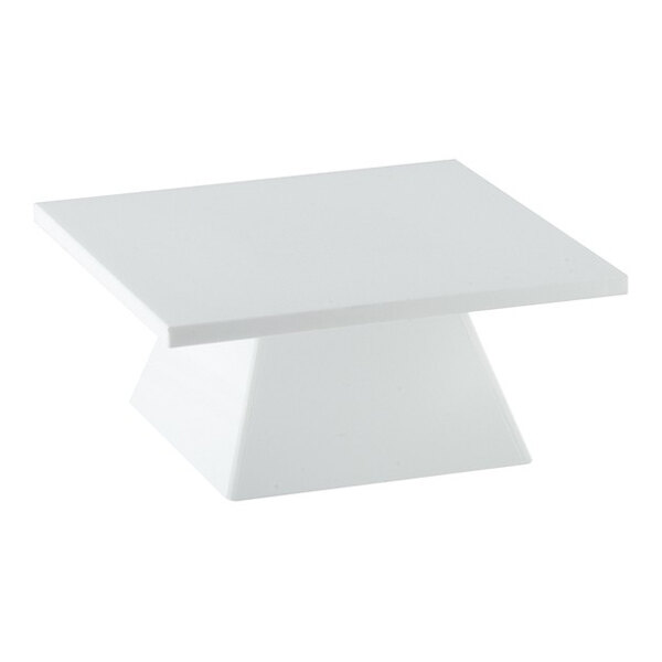 The sleek, flat platter allows you to optimize your work area for full use of the 9 1/2" square. Made from lightweight, durable acrylic, the platter is supported by a pyramid shaped base for added balance and stability. With this contemporary pedestal riser, you can be sure your fresh-baked desserts, in-house pastries, and more of your popular hand-made delicacies are safe while on display!