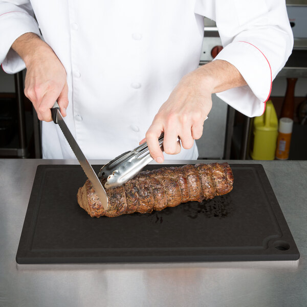 This cutting board is a sleek black color that adds sophistication and is ideal for use at a serving station or elsewhere in your establishment. Handy and effective, this cutting board makes an excellent addition to any kitchen or front-of-house application! It is easy to clean and reuse for everyday use.