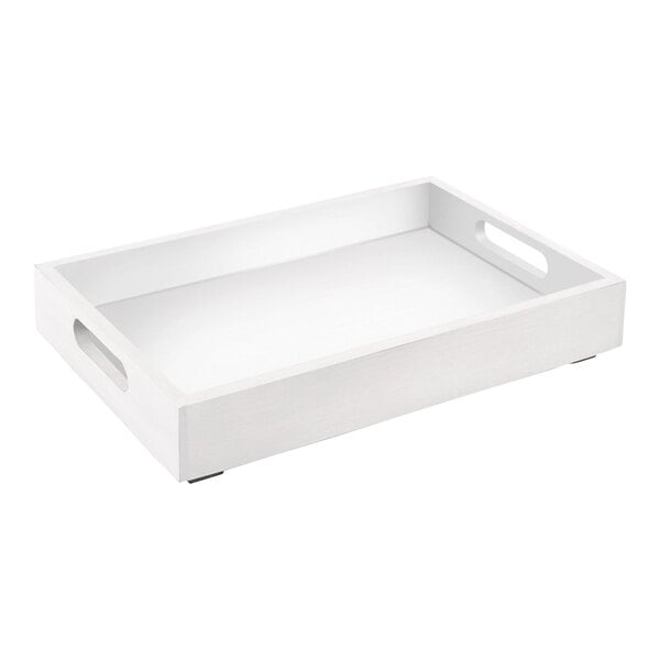 Easily serve guests their requested meals in your hotel or bed and breakfast with this Cal-Mil 3475-1-15 15" x 12" x 2 3/4" white plastic room service tray with handles! Boasting a crisp, white color and glossy surface, this tray will provide great contrast against your colorful dinnerware items and foods. It also features 2 3/4" high edges with handles to contain items, help prevent accidental messes, and promote easy transportation.