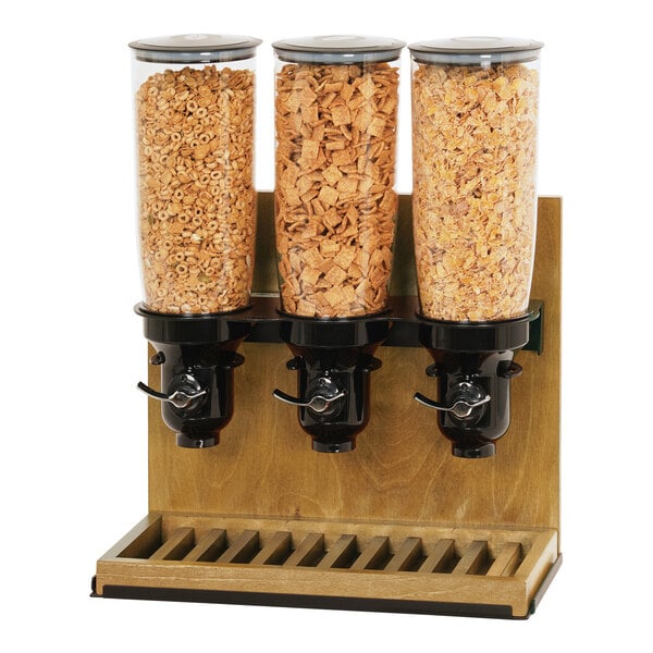 Provide your guests with three of your most popular cereals simultaneously with this Cal-Mil 3576-3-99FF Madera 15 liter triple canister free flow cereal dispenser. This cereal dispenser makes serving cereal effortless and fun! Made from durable, clear acrylic, it allows for optimal product visibility for easy identification. The wood base with black accents also adds a unique flair that works great in cafes, hotels, breakrooms, and school cafeterias. Additionally, each of the three cylinders holds 5 liters, for an impressive 15 liter overall capacity. Fill each according to your preference!