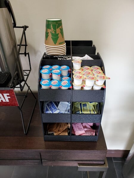 The open design notifies staff when refills are necessary, promising your customers never run out of their favorite condiments. Its sturdy plastic construction is also durable and easy to clean. For superior organization at your restaurant or hotel beverage station, look no further than this bulk condiment organizer.
