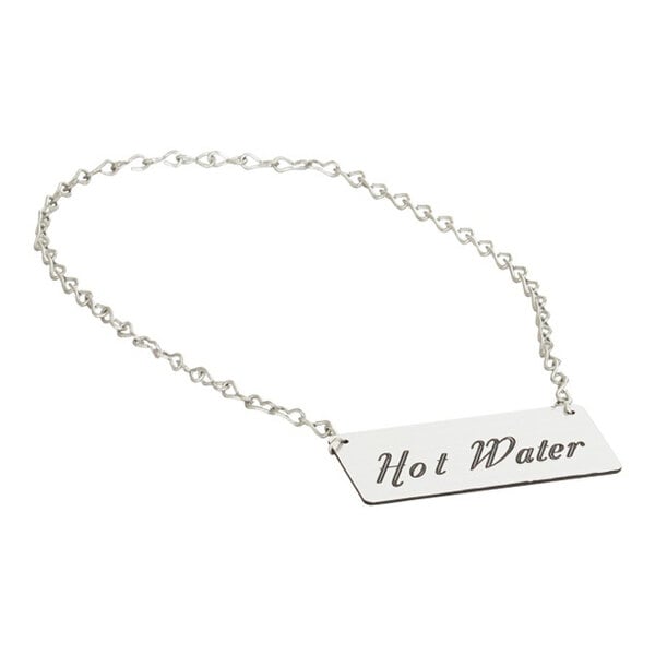 Elegantly identify the contents of your chafer urns or beverage dispensers with this attractive Cal-Mil 618-3 "Hot Water" urn chain sign. The urn chain sign has "Hot Water" engraved on the attractive silver sign to help your guests quickly identify the beverage of their choice! This 4" x 2" face is attached to a 24" long chain, making it ideal for all sizes of dispensers and urns. Simply wrap the chain around the hanging spot as many times as necessary to get the proper length.