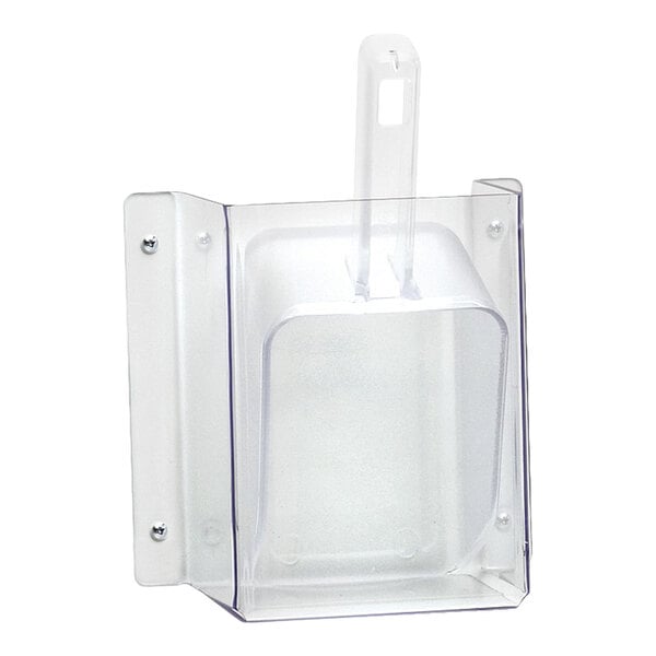 This Cal-Mil 624 wall mount scoop guard with 32 oz. scoop provides a convenient, sanitary solution for a variety of uses. This holder set easily mounts to your wall for convenient access. Whether you need it for use in an ice bin or for bulk ingredients, this set will keep a suitable scoop nearby without it resting on or coming in contact with unsanitary surfaces. Made of durable polycarbonate, this unit is extremely durable, lightweight and easy to use. Its clear color also allows you to always see that your scoop is clean and ready to use. From concession stands and kiosks to restaurants and smoothie bars, this scoop and holder combo set is ready to scoop 32 oz. of ice, flour, or other ingredients!