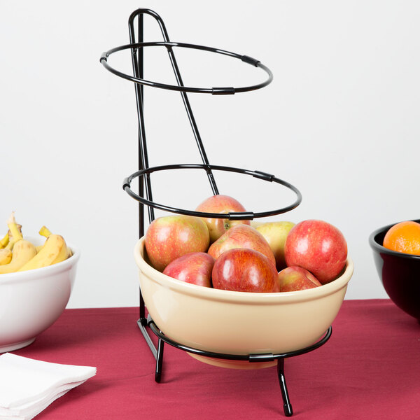Create a stepped, space-saving display in this Cal-Mil C1222-10 three tier round bowl stand! This sleek black stand is made out of an attractive steel wire frame that's designed to look and feel like wrought iron for excellent presentation and durability. Plus, its rubber feet protect surfaces from scratches and prevent sliding around on countertops. This organizer can hold bowls 10" in diameter (sold separately). Able to utilize vertical storage space, this versatile stand is perfect for displaying and storing condiment packets, creamers, pre-packaged snacks, and more at your coffee station, buffet, restaurant, or convenience store.