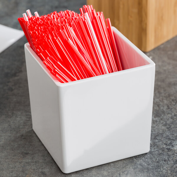 Use the Cal-Mil C1432BODY melamine jar to stay organized and keep counters and tabletops free of clutter by storing sugar packets, individual coffee creamers, drink stirrers and more in this square, white jar. Made of durable melamine, this jar is both decorative and break-resistant. Perfect for creating an ornamental display in any establishment, this 4" square jar is also great for holding potpourri, flatware, loose tea, and spices. Optional solid and notched lids sold separately.