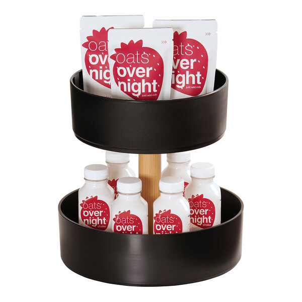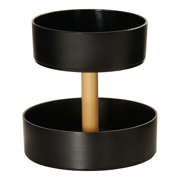 The 2-tier design maximizes vertical storage, minimizing the counter space required. The sleek black finish of the bowls, paired with a maple wood pedestal, delivers a modern look for your food presentations. Enhance your display setup with this stylish and functional merchandiser, which combines durability with contemporary aesthetics, making it perfect for upgrading the overall appearance of your buffet or merchandising arrangement.