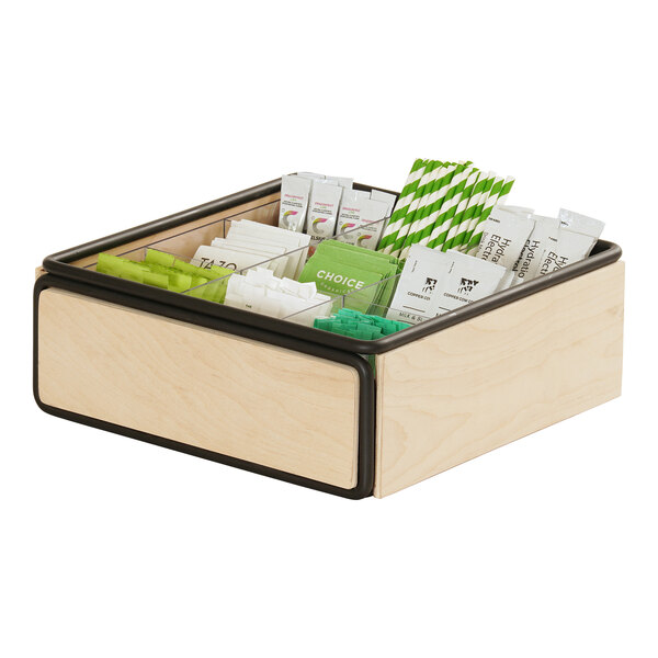 Featuring a sleek black metal frame and durable birch wood sides, this stylish condiment organizer includes 9 sections to help you organize all your condiments without taking up too much counter space. It's perfect for restaurants, cafes, and coffee shops. You can also mix and match this napkin holder with other Cal-Mil Logan items (sold separately) for a chic and modern display.