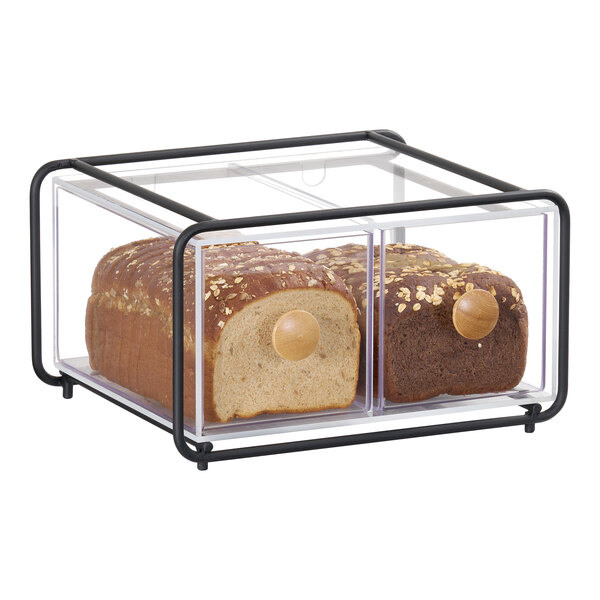 Entice your patrons to purchase your baked goods with this Cal-Mil Logan 2-drawer bread display case. This bread case features a modern round-wire design that enhances the visual appeal of your offerings. It comes with 2 clear acrylic drawers that provide excellent product visibility, and is equipped with wooden knobs for easy access. This case is perfect for keeping bread at your breakfast buffet, delis, or sandwich shops, protected it from airborne contaminants.