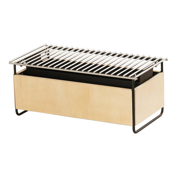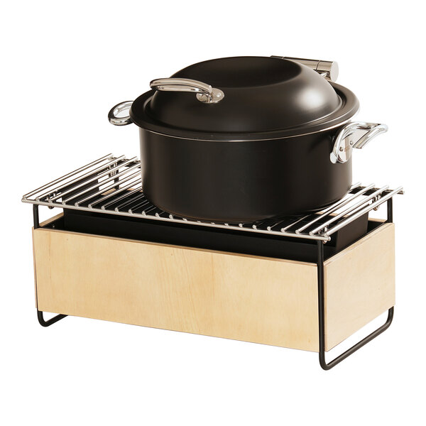Enhance the presentation of your buffet tables with this Cal-Mil Logan natural birch wood and black wire chafer alternative! A unique alternative to traditional chafers, this unit offers a contemporary design that is sure to impress your guests. The minimalist frame is made of durable birch wood and features black round-wire detailing for an eye-catching look. The wire grill works with a wide variety of pots and pans and is removable to easily add canned chafer fuel (sold separately), secured by the included fuel cell rail.
