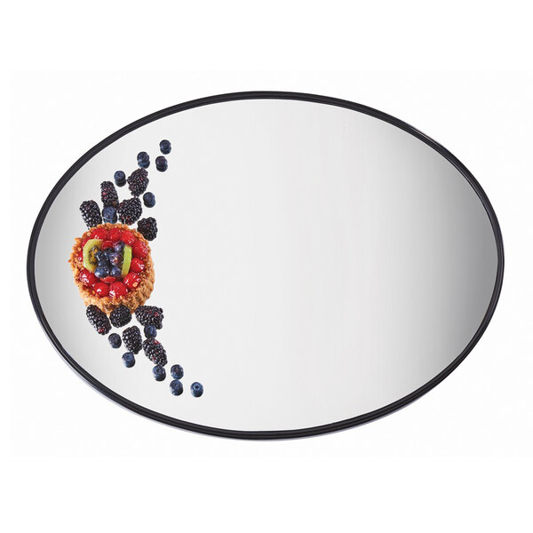 Add an enchanting feel to your food presentations with this Cal-Mil RR242 24" x 18" oval mirror tray with a raised black rim. Its mirror top will beautifully reflect your display of appetizers, desserts, and more, optimizing your guests' dining experience and giving them a great view of their food! The scratch-resistant surface is easy to clean and will maintain its shine for repeated use at your hotel, restaurant, or catered events. Plus, its 1" thick black rim adds durability while helping to keep accidental spills contained on the tray.
